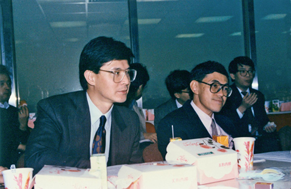 1988年12月,罗康瑞(左)与胡经纬(右)在香港上海实业有限公司座谈。